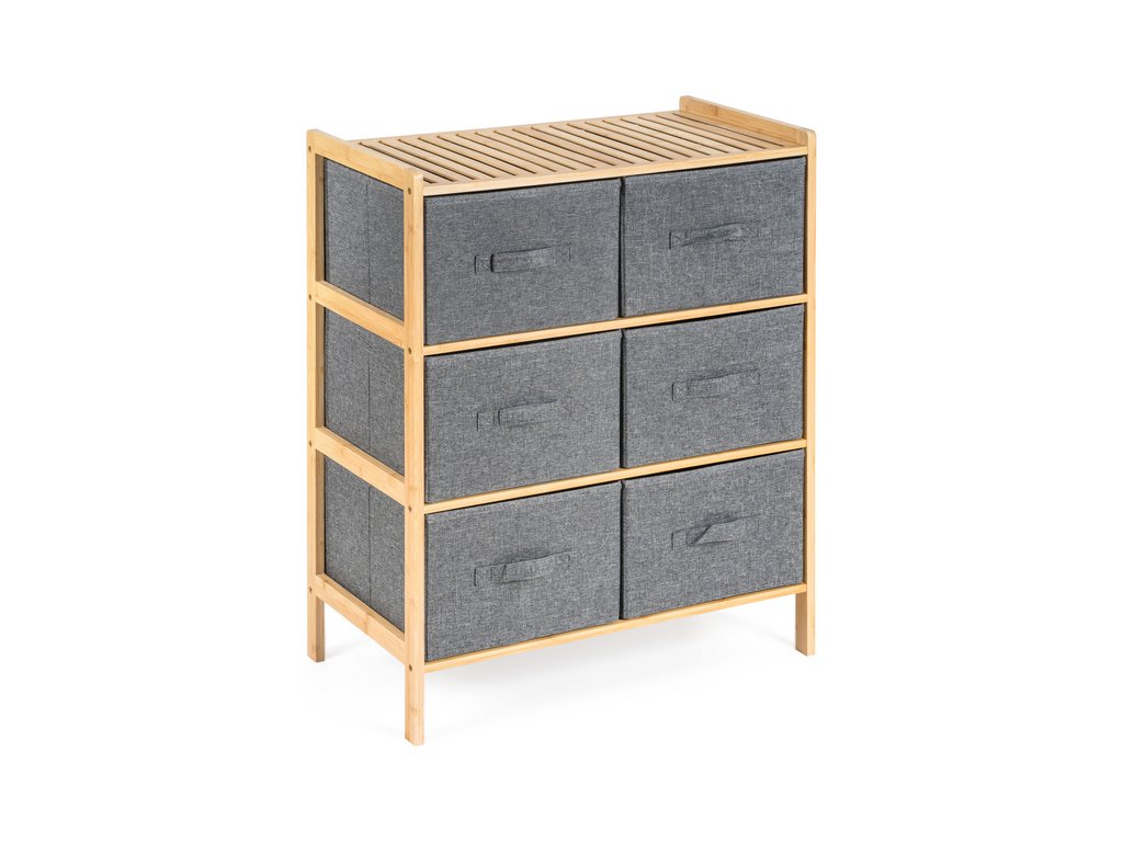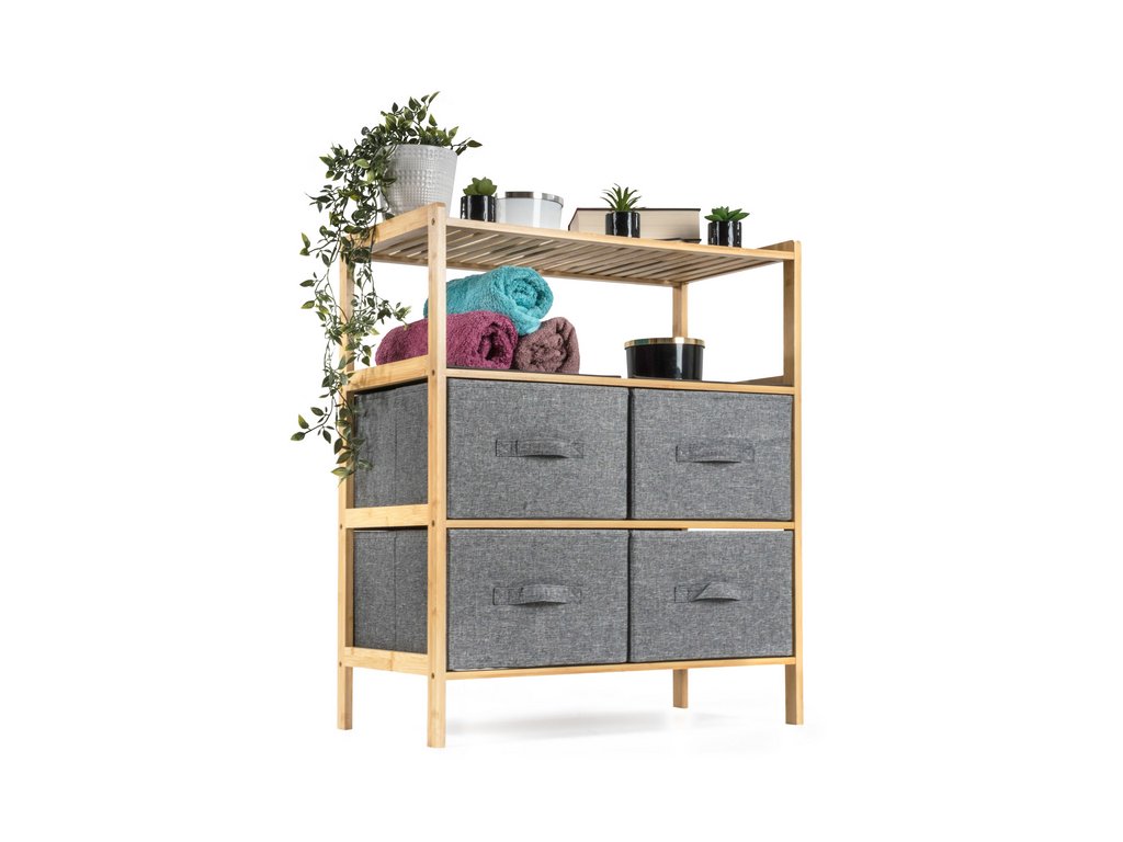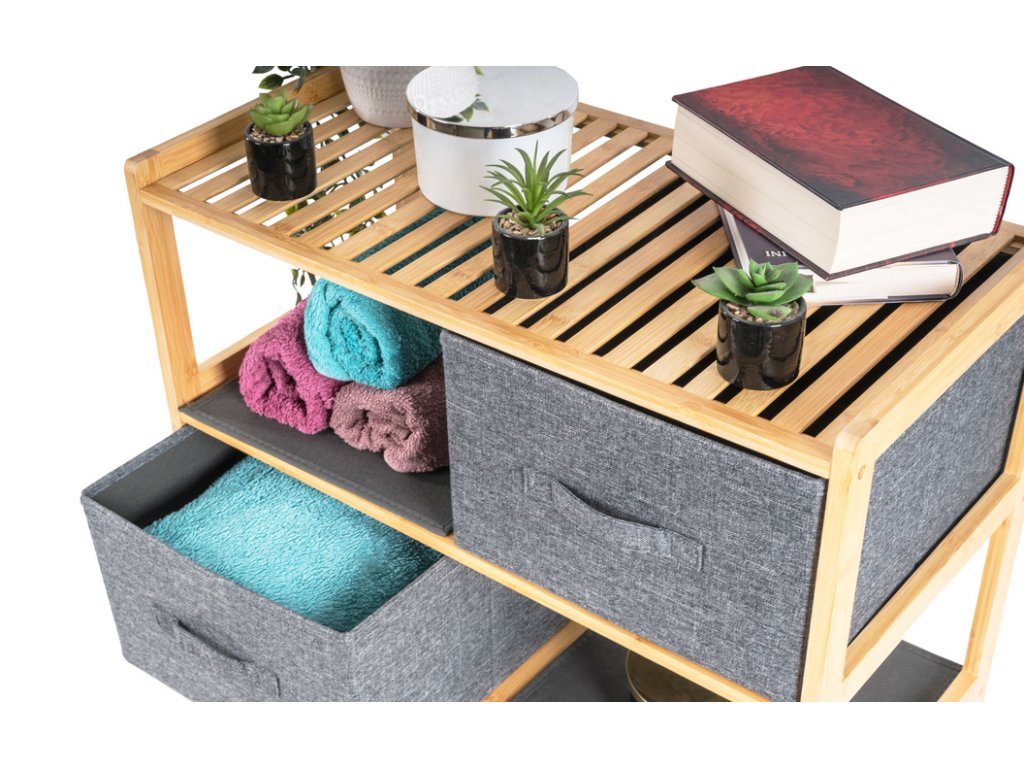 Bambusový regál s výsuvnými látkovými zásuvkami dodává interiéru příjemný přírodní dojem, pocit lehkosti a přirozenosti, zatímco jeho pevnost a dlouhá životnost zajišťují stabilitu a trvanlivost.