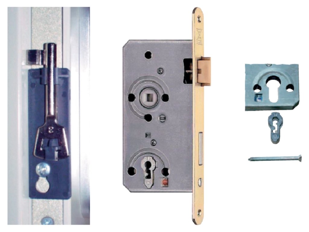 - Zadlabací zámek s dozickým klíčem (PZ děrování) - příprava pro jednoduchou instalaci cylindrické vložky bez nutnosti výměny zadlabacího zámku