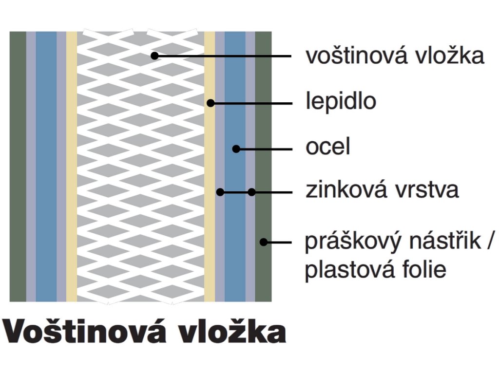 - Konstrukce - dřevěný rám vyplněný hustou voštinou, oboustranně celoplošně slepeny s ocelovým plechem 0,6 mm