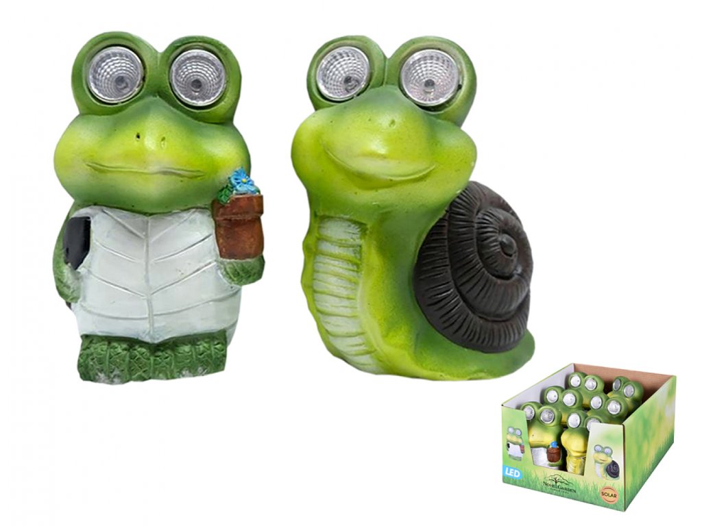 Solární lampa v podobě zvířátek. Nabízí kombinaci zahradní dekorace a zároveň praktickou hodnotu svítidla. Zvířátka jsou vyrobena z cementu, který jim dodává pevnost a také odolnost vůči povětrnostním vlivům. Lampa se během dne nabíjí a za šera ji zabudovaná fotobuňka automaticky zapíná. Ve tmě lampa svítí cca 6 hodin. Obsahuje LED žárovky. Obsahuje dobíjecí baterii: 1,2V Ni-MH 40 m Ah. Rozměry: délka 10 cm, výška 15 cm, hloubka 9 cm.