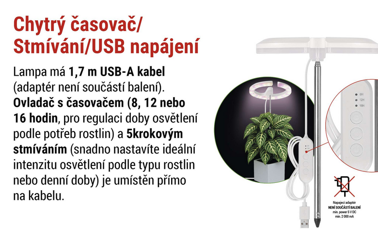 - bílé LED napodobují přirozené denní světlo, podporují fotosyntézu, zdravý růst listů a celkovou vitalitu rostlin