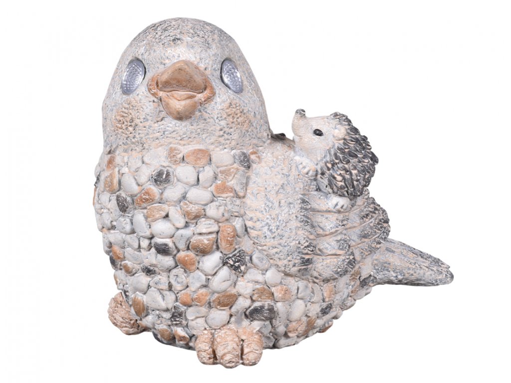 Solární lampa v podobě ptáčka. Nabízí kombinaci zahradní dekorace a zároveň praktickou hodnotu svítidla. Zvířátka jsou vyrobena z cementu, který jim dodává pevnost a také odolnost vůči povětrnostním vlivům. Lampa se během dne nabíjí a za šera ji zabudovaná fotobuňka automaticky zapíná. Ve tmě lampa svítí cca 6 hodin. Obsahuje LED žárovky. Obsahuje dobíjecí baterii: 1,2V Ni-MH 40 m Ah. Rozměry: délka 14 cm, výška 22 cm, hloubka 20 cm.