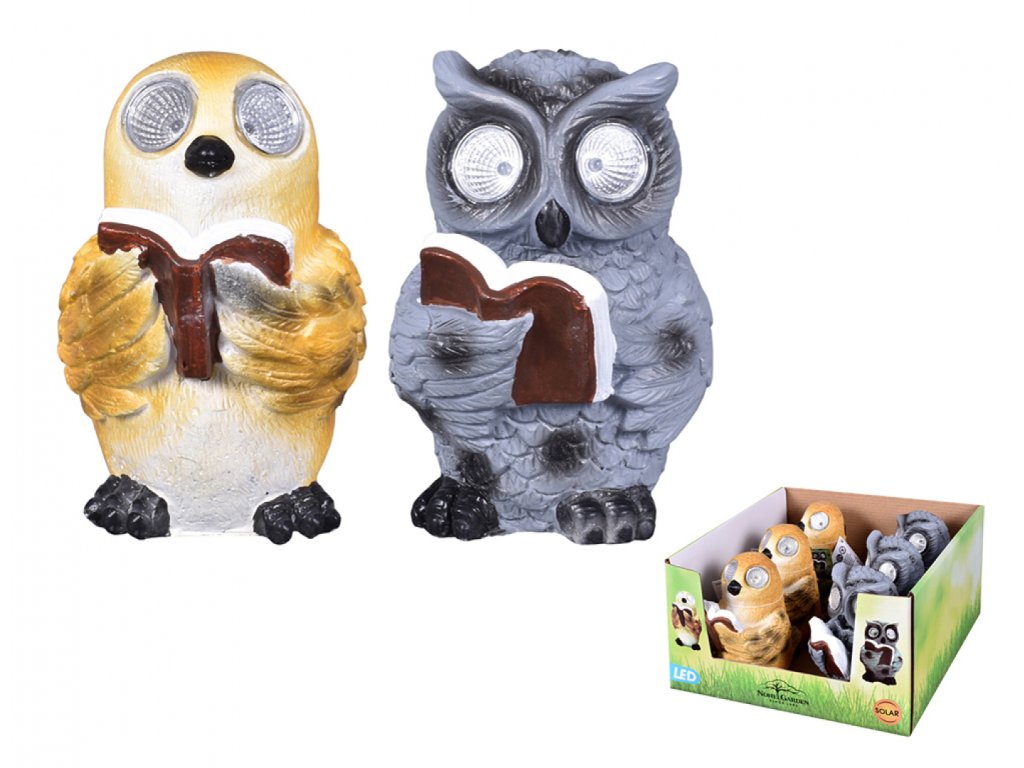 Solární lampa v podobě sovy. Nabízí kombinaci zahradní dekorace a zároveň praktickou hodnotu svítidla. Zvířátka jsou vyrobena z cementu, který jim dodává pevnost a také odolnost vůči povětrnostním vlivům. Lampa se během dne nabíjí a za šera ji zabudovaná fotobuňka automaticky zapíná. Ve tmě lampa svítí cca 6 hodin. Obsahuje LED žárovky. Obsahuje dobíjecí baterii: 1,2V Ni-MH 40 m Ah. Rozměry: délka 14 cm, výška 16 cm, hloubka 10 cm.