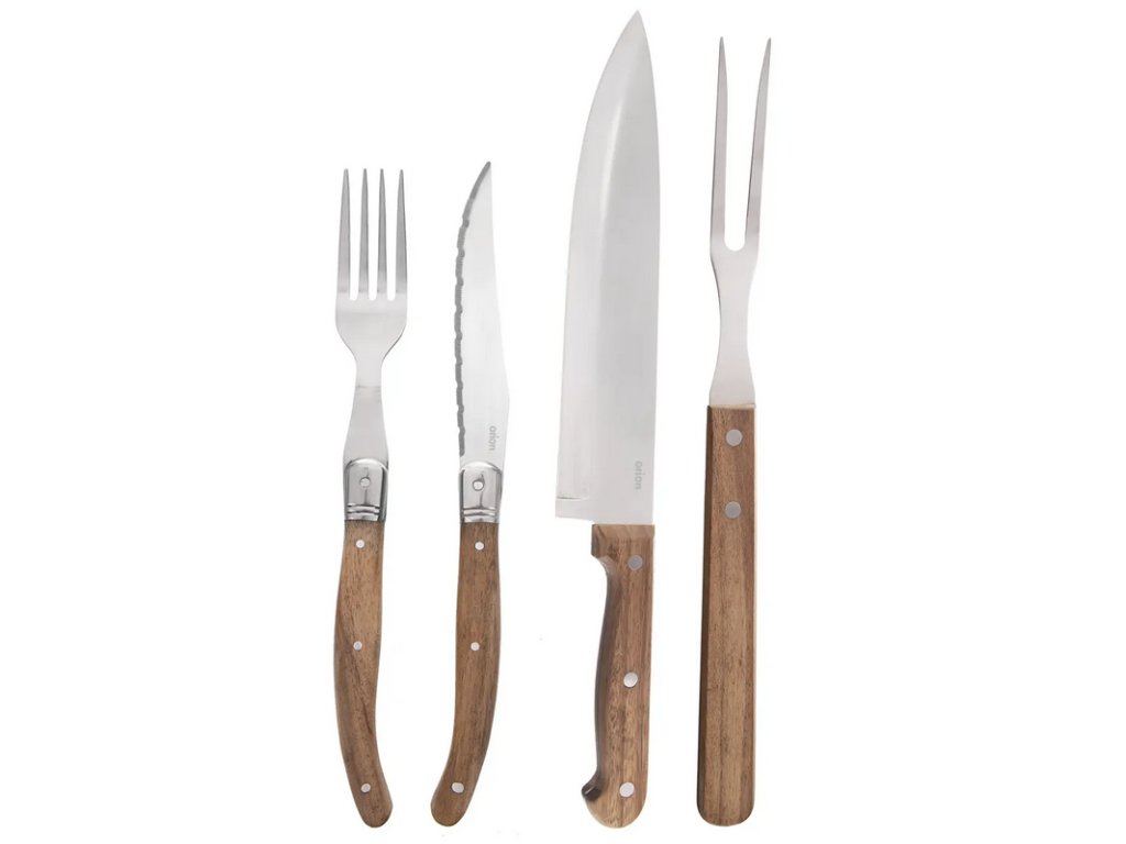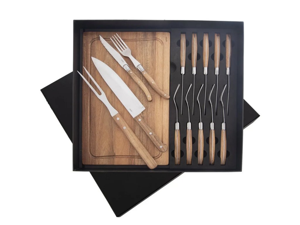 Dárkový set steakových nožů, které doplňuje prkénko z akáciového dřeva a servírovací příbor, potěší každého gurmána. Nože s rukojetí z akácie mají nerezové zubaté ostří, takže si hravě poradí se steaky.