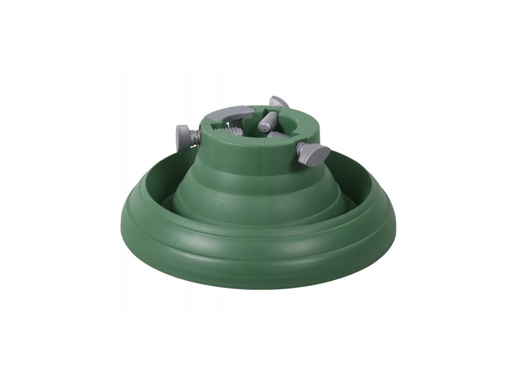 Plastový tmavě zelený kruhový stojan pro vánoční stromky. Stojan má širší základnu, která se kónicky zvedne, poté klesne a opět se zvedle, vše probíhá směrem ke středu stojanu. Vznikne tak prostor pro podání výživy a vody vánočnímu stromku. Kmen stromu je umístěn v prostřední části, kde je uchycen a vyrovnán pomocí 3 šroubů. Rozměry: d. 39,7 x v. 14,5cm.