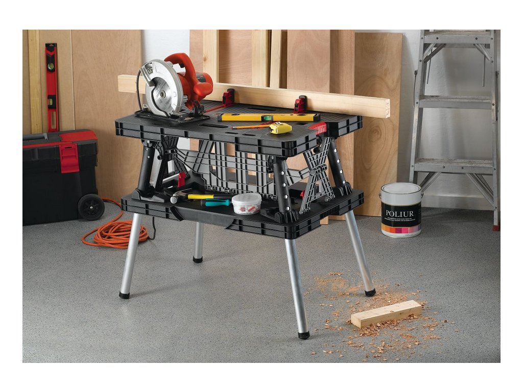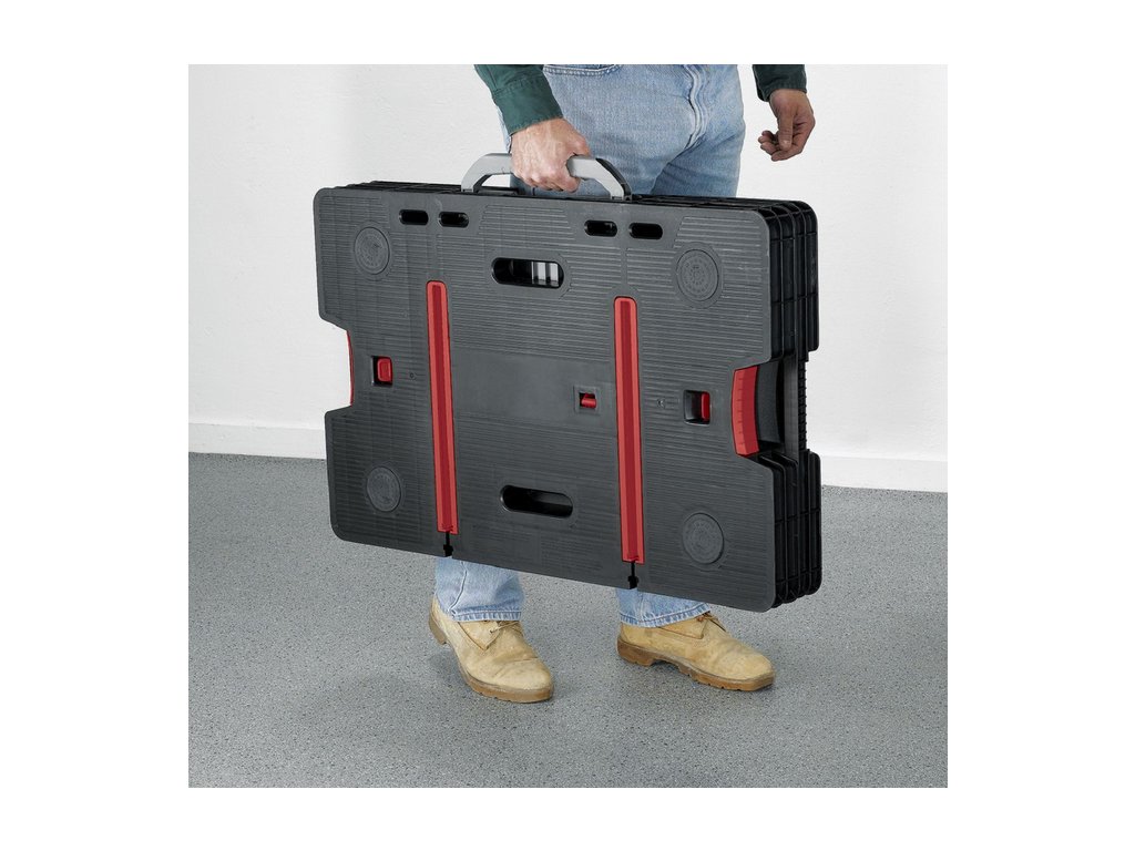 Tento přenosný stůl se zabudovanou rukojetí velmi snadno sestavíte (nezabere to více než půl minuty). Přitom nosnost činí 453 kilogramů. Součástí jsou dvě 30cm svorky, které lze nainstalovat horizontálně i vertikálně, nebo jednoduše odejmout.