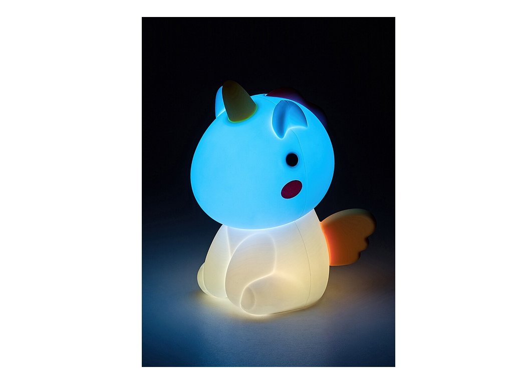Okouzlující a všestranná dětská lampa Unicoo bude oblíbenou součástí každého dívčího dětského pokoje. Plastovou lampu ve formě jednorožce doplňuje vícebarevné, na dotek jemné silikonové stínítko. Noční světlo s možností RGB lze ztlumit dotykovým spínačem, takže jas lze nastavit dle potřeby. Svítilna se dobíjí pomocí USB kabelu, napětí baterie je 3,7 V a kapacita 1200 mAh. Doba nabíjení je 4,5 hodiny a provozní doba se pohybuje od 8 do 50 hodin. Dekorativní lampa s noční funkcí má zabudovaný LED světelný zdroj s příkonem 0,45 W, jasem 30 lumenů se stínítkem, 55 lumenů bez stínítka a životností 10 000 hodin. Světelný zdroj má barevnou teplotu 3000 K a vyzařuje odpovídající teplé bílé světlo. Může pomoci vytvořit v místnosti útulnou, domácí atmosféru a tento typ světla je ideální také pro relaxaci a spánek. Noční svítidlo Unicoo má výšku 140 mm, šířku 110 mm a délku kabelu 500 mm.
