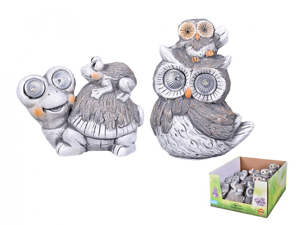 Solární lampa v podobě zvířátek s mláďaty. Nabízí kombinaci zahradní dekorace a zároveň praktickou hodnotu svítidla. Zvířátka jsou vyrobena z cementu, který jim dodává pevnost a také odolnost vůči povětrnostním vlivům. Lampa se během dne nabíjí a za šera ji zabudovaná fotobuňka automaticky zapíná. Ve tmě lampa svítí cca 6 hodin. Obsahuje LED žárovky. Obsahuje dobíjecí baterii: 1,2V Ni-MH 40 m Ah. Rozměry: délka 16 cm, výška 12 cm, hloubka 10 cm.